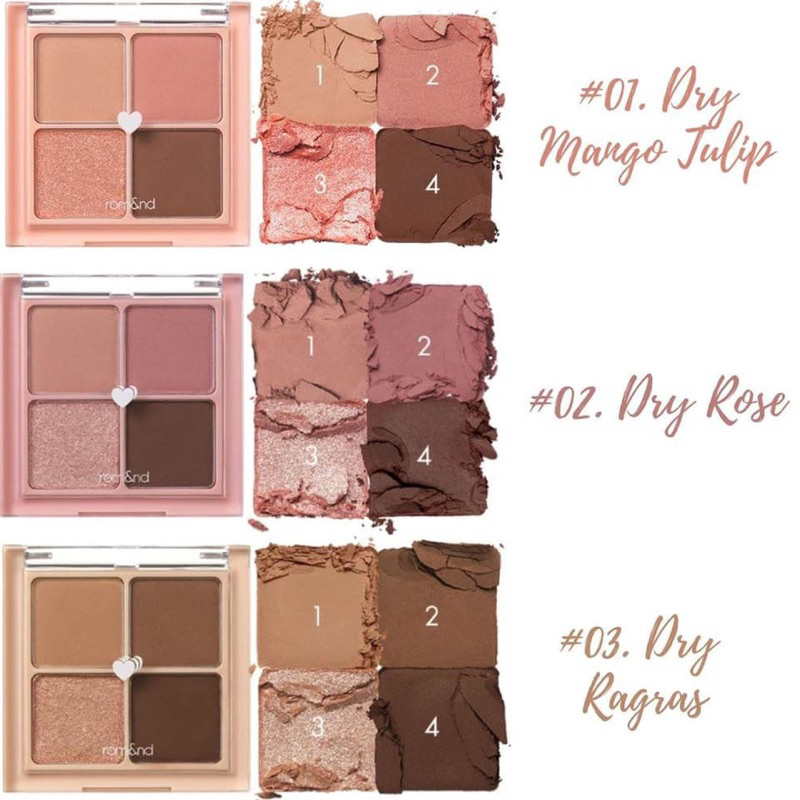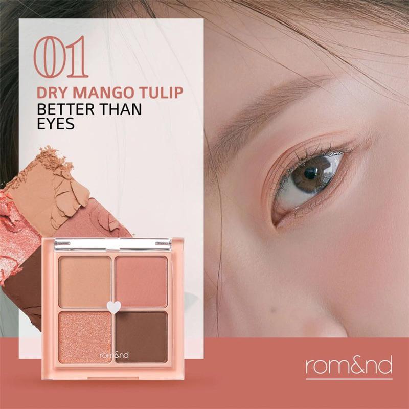Bảng màu mắt 4 ô Romand Better Than Eyes là phấn mắt của thương hiệu Romand lấy cảm hứng từ những cánh hoa hồng khô màu sắc hài hòa, nhã nhặn có thể kết hợp các màu với nhau, độ lên màu chuẩn cũng độ bám màu ổn định cho bạn sở hữu đôi mắt long lanh, bắt sáng lấp lánh thu hút mọi ánh nhìn