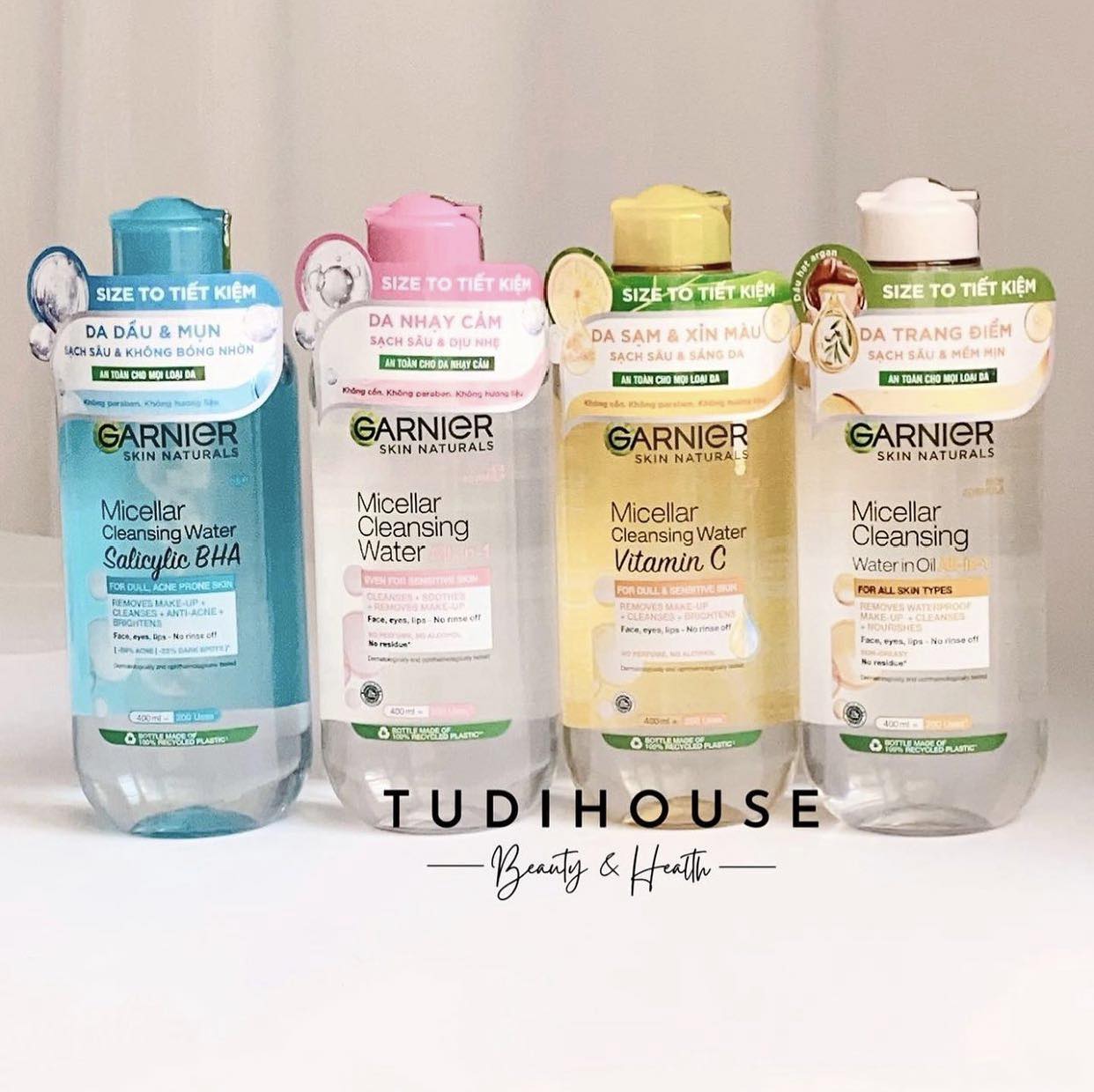 Nước làm sạch và tẩy trang dành cho mọi loại da Garnier Micellar Water, bạn có thể chọn phân loại phù hợp với da bạn. Màu hồng: dành cho da nhạy cảm. Màu xanh dương: dành cho da dầu và mụn. Màu vàng: giúp làm sáng da, hỗ trợ loại bỏ nám. Màu trắng: dành cho mọi loại da, đặc biệt da khô và da trang điểm.