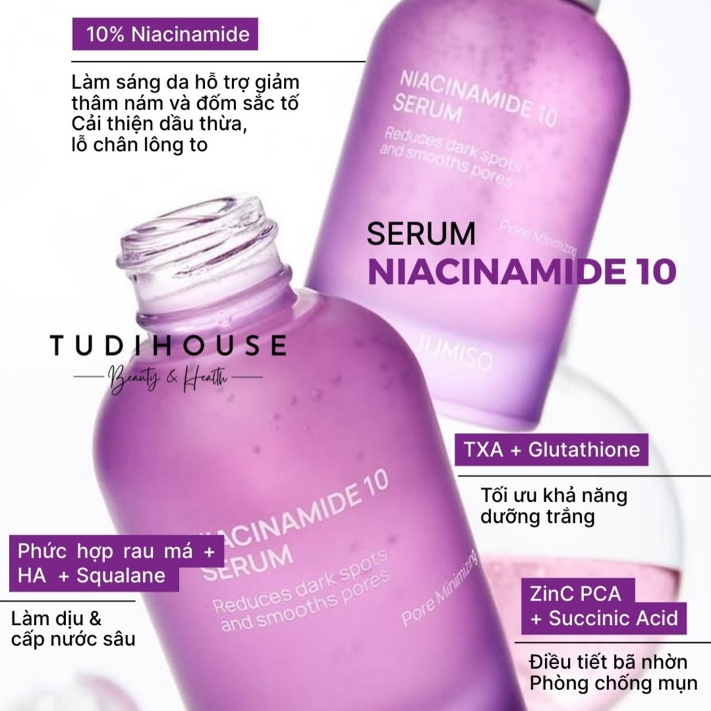 Tinh Chất Jumiso Niacinamide Serum với Niacinamide (Vitamin B3 tinh khiết), tinh chất giúp ức chế sản sinh melanin, làm mờ vết thâm, nám và đốm nâu do mụn hoặc tia UV gây ra giúp cải thiện làn da đều màu hơn mà còn giúp kiểm soát bã nhờn, hỗ trợ thu nhỏ lỗ chân lông, cho bề mặt da mịn màng.